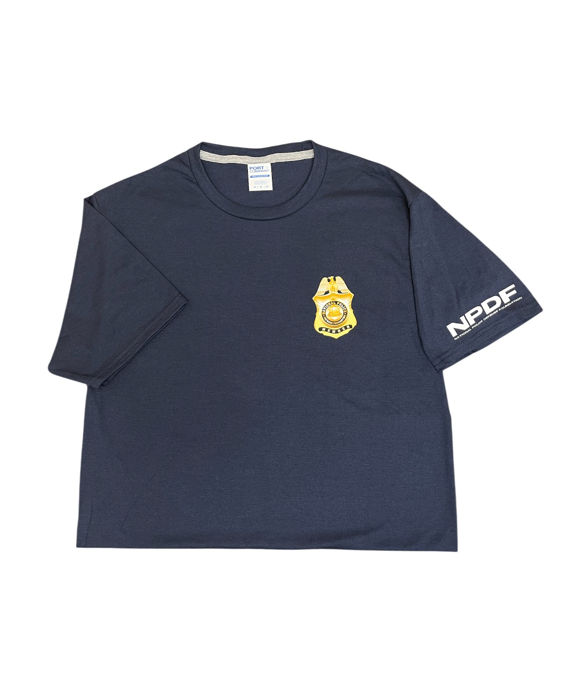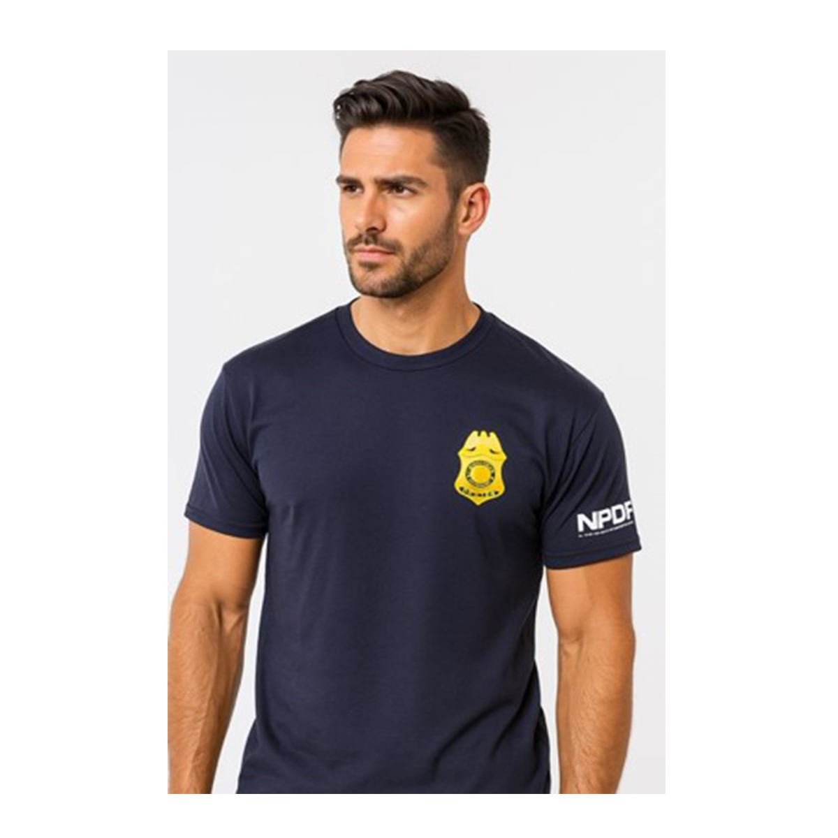 Short-sleeve tee showcasing a screen-printed NPDF gold badge and sleeve text graphic.