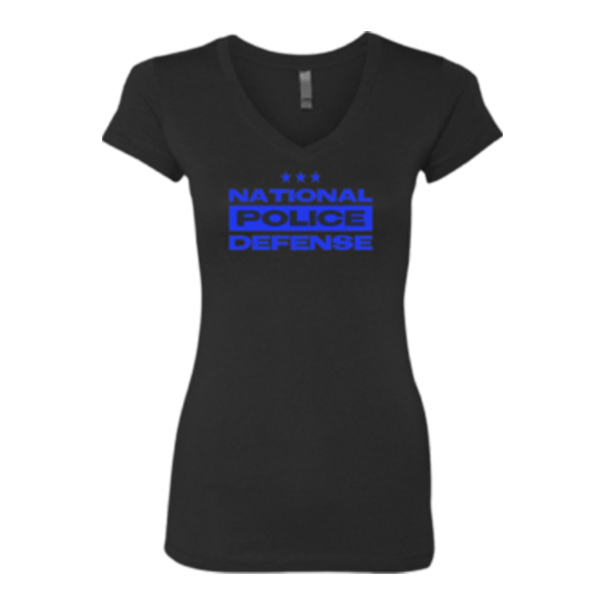 Women’s black V-neck t-shirt featuring a bold “National Police Defense” front print.